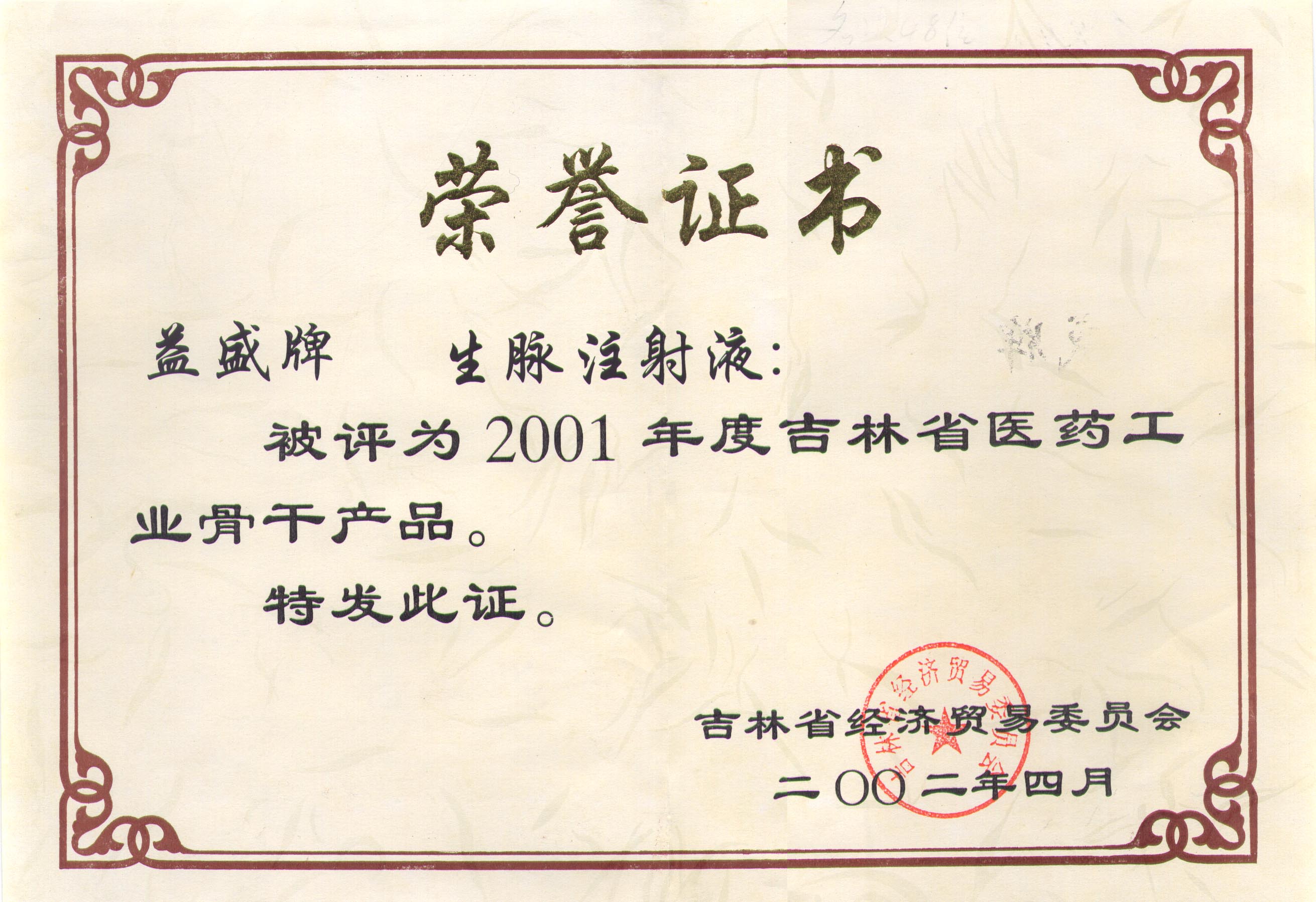 生脉注射液评为2001年度吉林省医药工业骨干产品