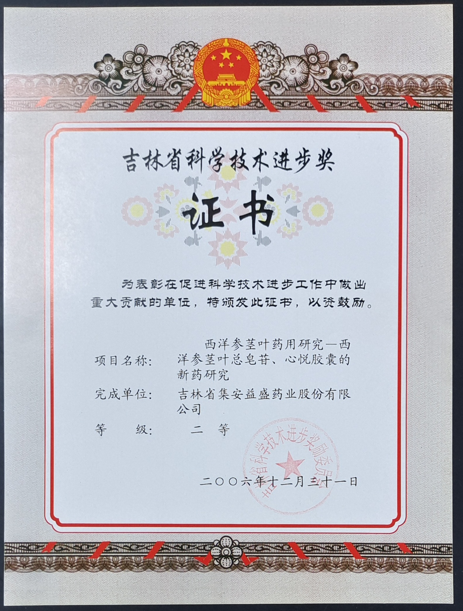 西洋参茎叶药用研究-西洋参茎叶总皂苷、心悦胶囊的新药研究获吉林省科学技术进步奖二等
