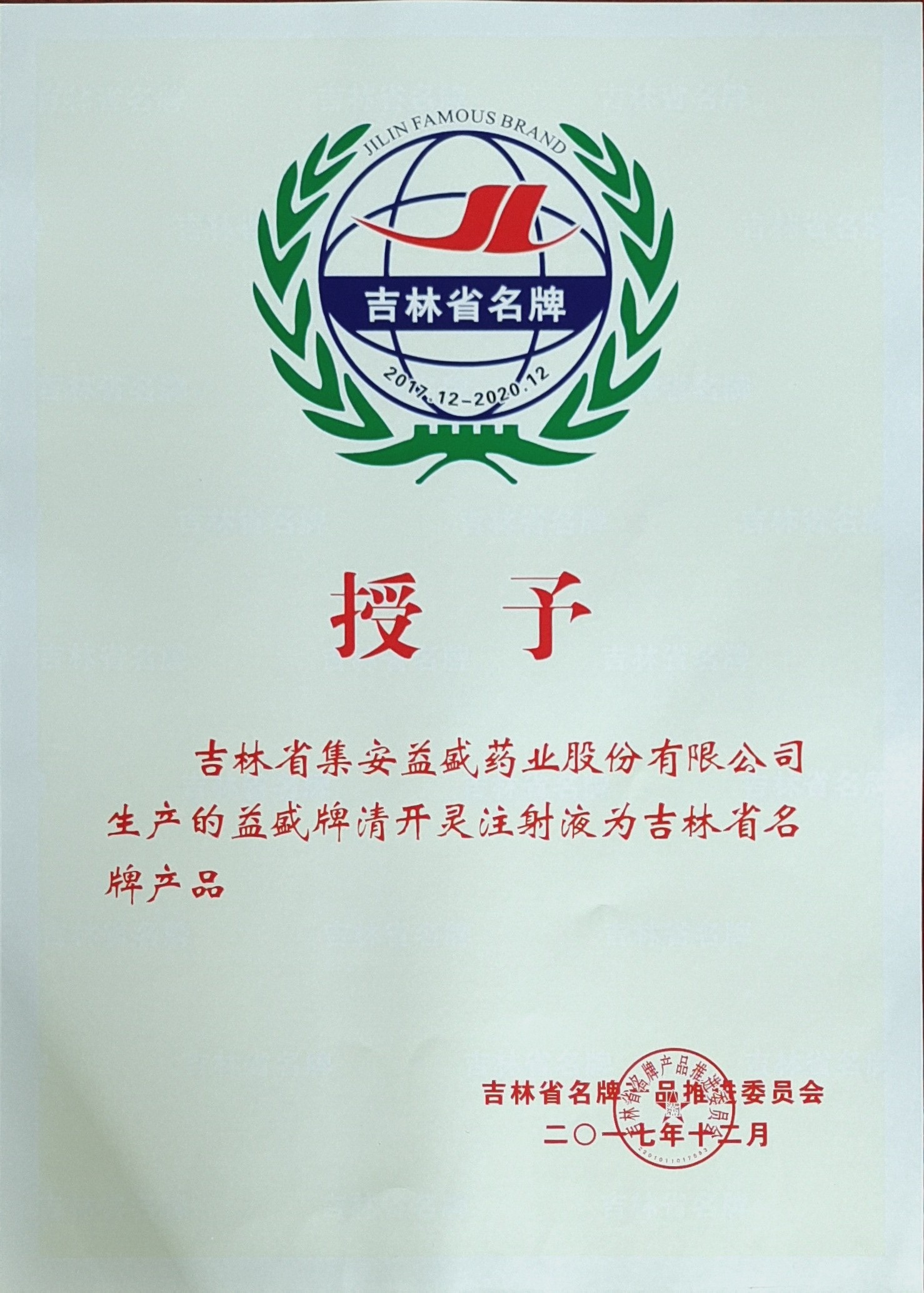 益盛牌清开灵注射液为吉林省名牌产品