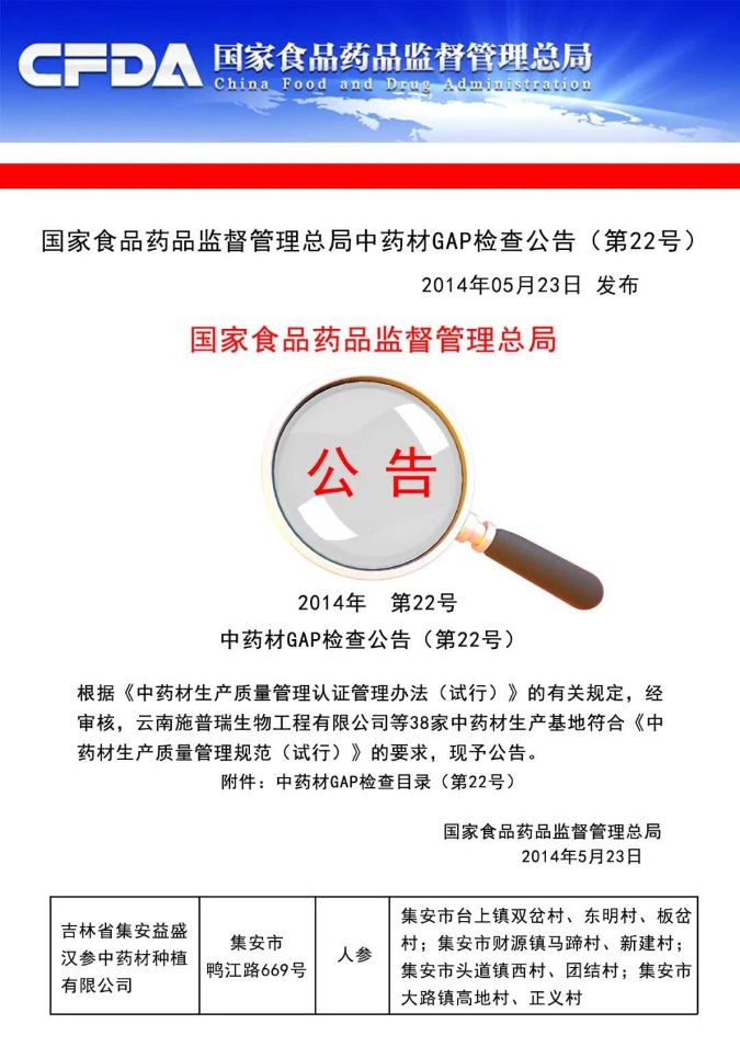 “汉参”种植基地,成为国内第一个获得GAP认证的非林地人参种植基地。“汉参”被国家质检总局认定为“生态原产地保护产品”。“汉参”及其制品全部获得有机认证。